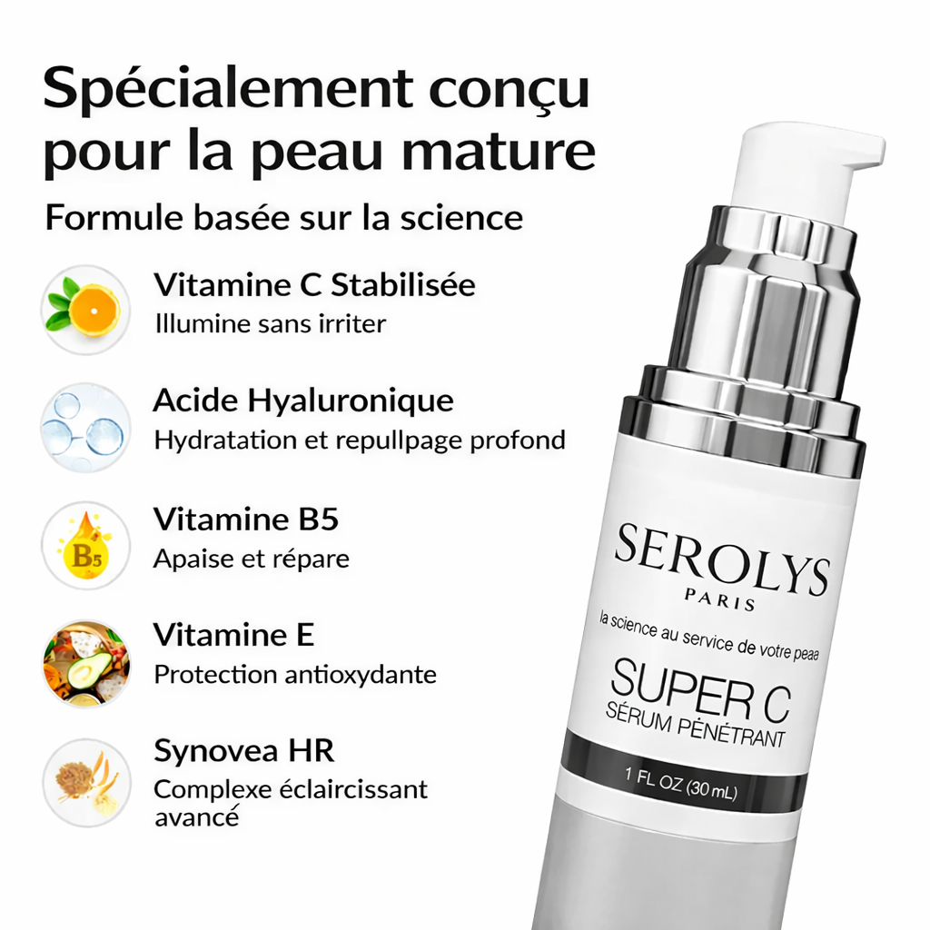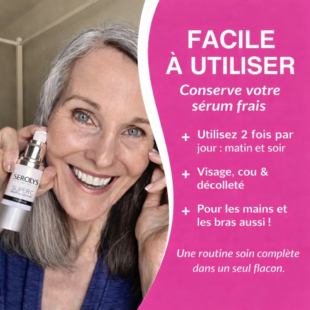 Appliquez le Super C Serum Serolys matin et soir sur le visage, le cou, et même le contour des yeux. Ce sérum multi-action combine plusieurs soins en un seul, pour un teint plus éclatant et une peau visiblement revitalisée.